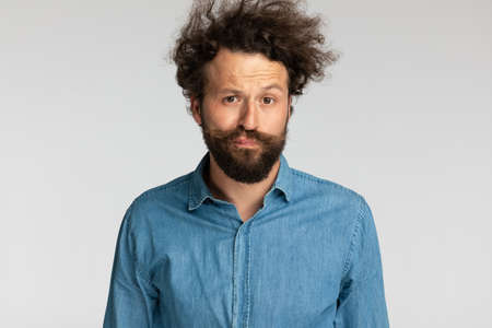 portrait of casual relaxed young man with curly hair and beard making funny faces and posing on grey background in studio