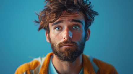 Portrait of adult bearded man with emotion of saddness on face looking at camera