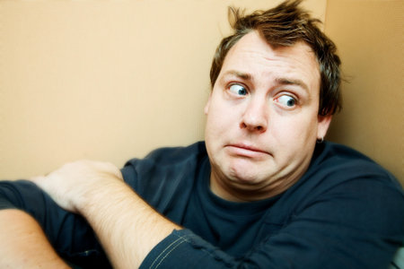 Close-up photograph of a man's expressive and startled facial reaction outdoors