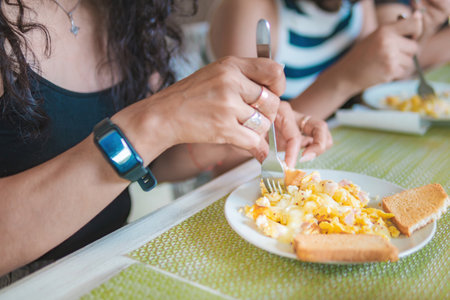 Family enjoys breakfast in the morning, consisting of eggs with toast and coffee.
