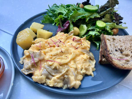 Cuisine and Food, Plate of Delicious Scrambled Eggs with Round Bread and Grilled Potatoes on A Wooden Table.