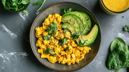 Top view of a protein-packed breakfast with scrambled tofu, avocado slices, spinach, and a smoothie glass on a grey table