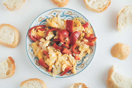 Peppers and Onions Scrambled Eggs with bread on a light background. The natural and healthy breakfast on my desk. Top view. Flat lay.