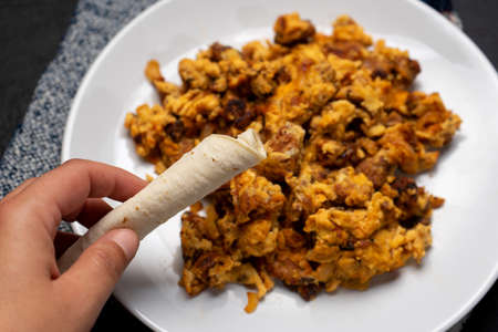 Traditional scrambled eggs with chorizo for breakfast on dark background. Mexican food