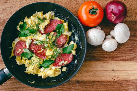 Fresh cooked scrambled eggs in pan with sausage and herbs. Tomato, onion, mushrooms on wooden board, top view
