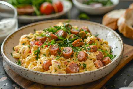 A mouthwatering breakfast scene featuring sausages, scrambled eggs, and toast sizzling in a skillet. Perfect for food lovers and culinary enthusiasts.