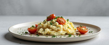 AI Generated. Freshly Made Scrambled Eggs with Cherry Tomatoes and Chopped Parsley on a Cream Plate