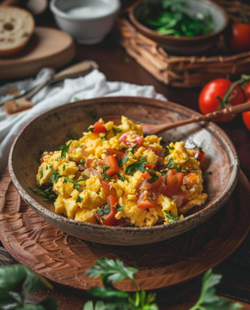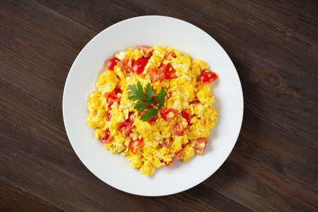 Scrambled eggs with tomatoes in a bowl Gourmet still life