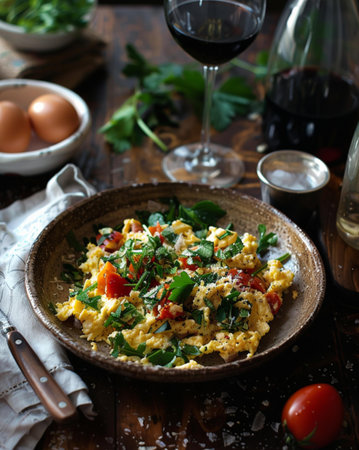 An artistic overhead shot of a breakfast table showcasing a plate of scrambled eggs with saut spinach and tomatoes, illustrating a healthy morning meal.