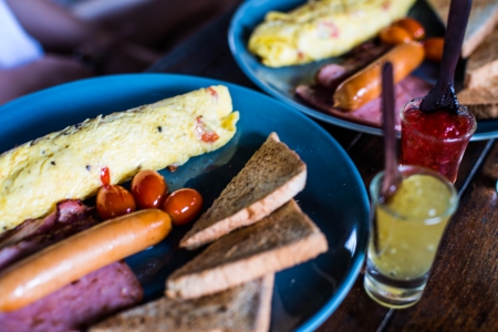 scramble egg with bread toasted and bacon