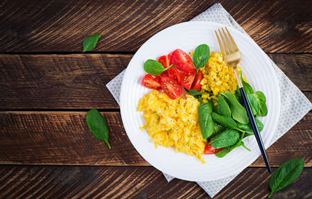 Breakfast. Scrambled eggs with cherry tomatoes, spinach and corn. Top view, flat lay, above