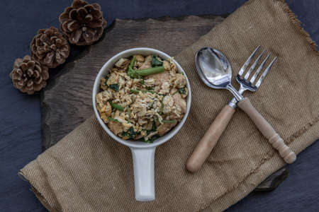 Thai food, Stir fried egg tofu with spring onion in white bowl, view from above.