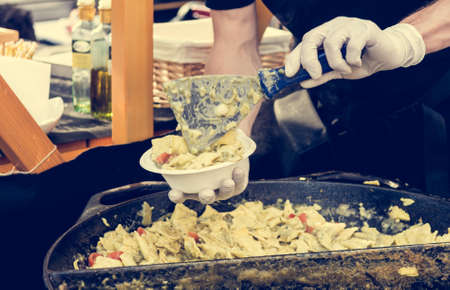 Chef serving tasty mix of gnocchi and pasta. Street food photography.