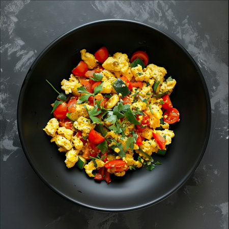 Egg and Veggie Scramble, Black Surface Table, minimalistic decor