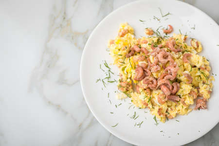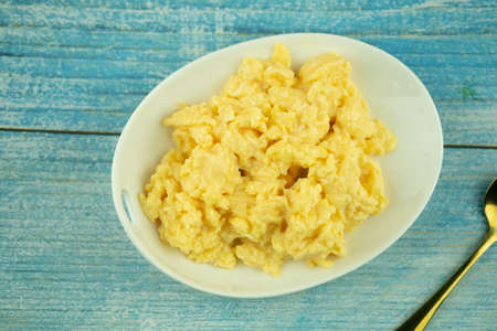 Top view of full of scrambled eggs in dish on wood table