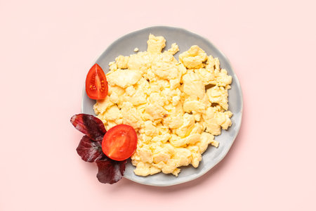 Plate of tasty scrambled eggs with tomatoes and basil on pale pink background