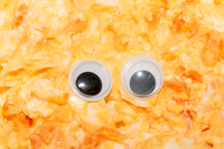 creative food background: macaroni and cheese with funny eyes