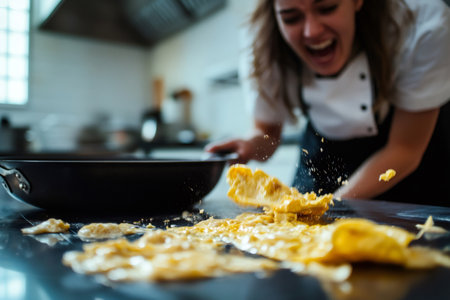 Young cook laughing joyfully as an omelette slips from the pan onto the kitchen counter, creating a lighthearted cooking mishap