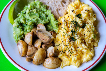 London UK June 25 2025, Scambled Eggs With Mashed Avacado Fried Musherooms and Seeded Bread