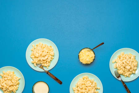 Above view with mac and cheese in plates on a blue background. Macaroni with bechamel sauce home-baked. American food.