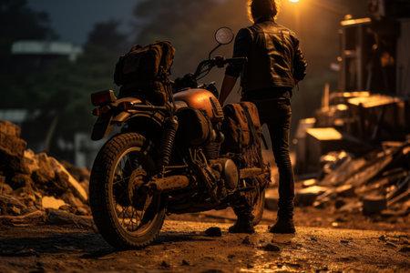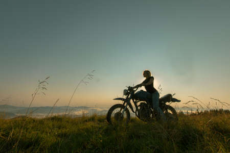girl on a motorcycle high in the mountains stopped to rest at dawn travels