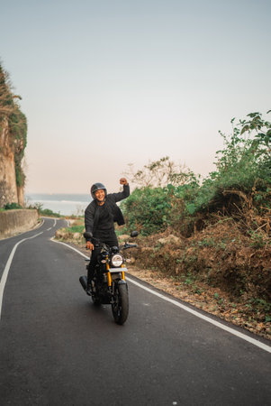 indonesian rider standing while riding motorbike with fist pump gesture