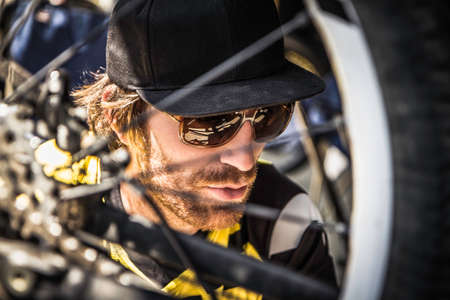 Close up of young male mountain biker checking bike wheel