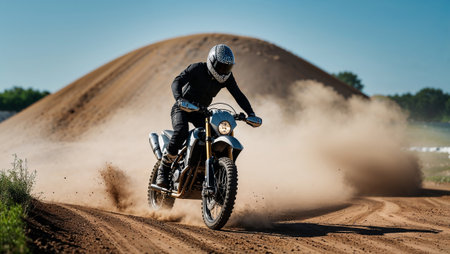 Professional motorcyclist speeding on a dirt track, kicking up a cloud of dust. Ai generated image