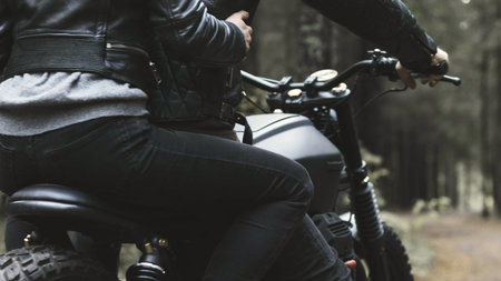 Rear view of a biker riding a motorcycle in the forest