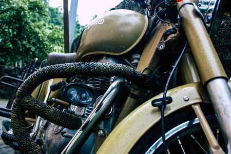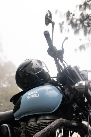 Kathmandu Nepal September 11, 2018 Closeup of a Royal Enfield motorcycle parked in the street of Kathmandu in the afternoon