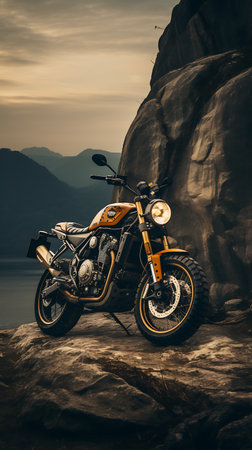 An AI generated illustration of a motorcycle that is sitting on a rocky hill side with a nice blue sky