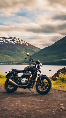 Beautiful view of a mountain lake with a motorcycle in the foreground