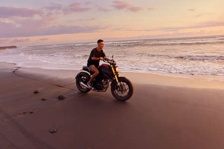 Man And Motorcycle On Ocean Beach At Beautiful Tropical Sunset. Handsome Biker On Motorbike On Sandy Coast In Bali, Indonesia.