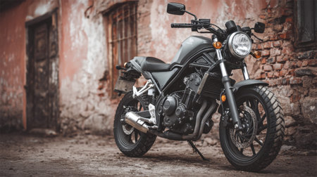 A stylish motorcycle stands parked against an aged, textured wall, showcasing the fusion of modern design and vintage architecture within an urban environment.