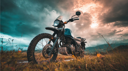 A stunning off-road motorcycle parked in a vibrant landscape, highlighting the thrill of outdoor adventures amid dramatic skies and natural beauty.