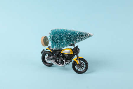 Motorcycle model with a Christmas tree on blue background. Minmal merry christmas layout
