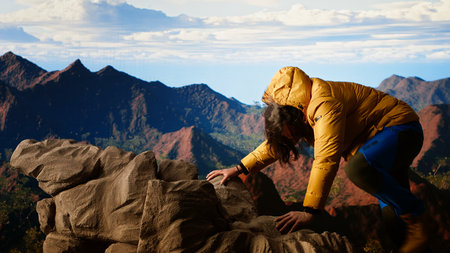 Hiker tripping and losing balance on the rocky mountain peak, struggling to climb unequipped in the extreme wilderness. Dangerous landscape for an unprepared explorer.