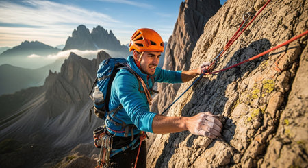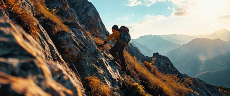 A man is climbing a mountain with a backpack and a helmet. The sun is setting in the background, creating a beautiful and serene atmosphere