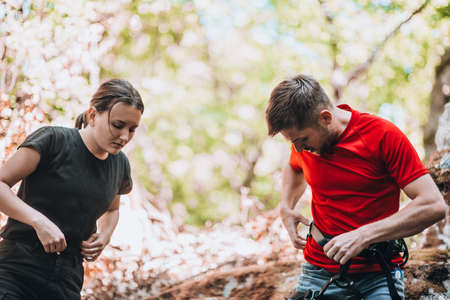 Young climbers alpinist prepare to rock-climbing on mountain peak