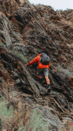 Male hiker wearing orange jacket and backpack climbing steep, rocky mountainside on a cloudy day