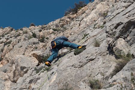 male climber with backpack and climbing equipment on the mountain. Sports mountaineering