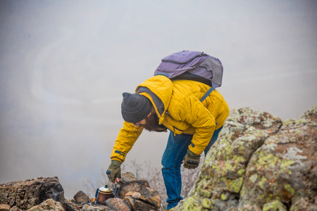 young ambitious tourist going trekking in the mountaines. risk, danger, extreme sport concept