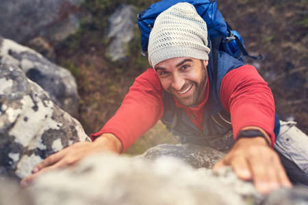 A cheerful young man with a stylish beard and tousled hair is climbing a rocky terrain, extending his hand towards the camera with a bright smile. His enthusiasm and adventurous spirit shine through as he embraces the thrill of the outdoors, showcasing the joy of exploration and connection with nature.