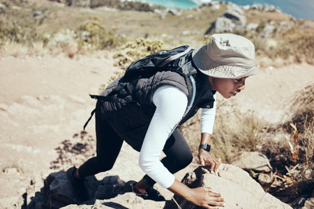 Woman, hiking and rock on mountain for climbing, workout or fitness. Girl, health and exercise for training, sport and wellness on adventure in nature in summer on hill, hiker and stone in Australia