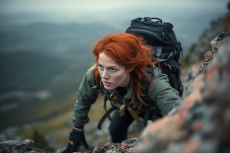 A person climbs a mountain overcoming obstacles to reach the summit created with Generative AI