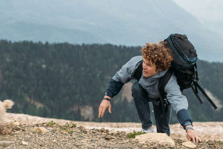 Man Hiking with a backpack crawling on rocky rocks to the top on the background of snowy mountains. Concept the hard way and goal achievement