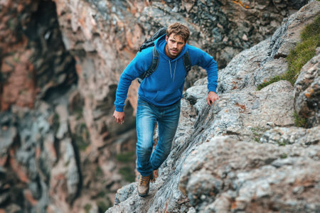 A man wearing a blue hoodie climbs rugged rocks in a mountainous area, showing determination and adventure.