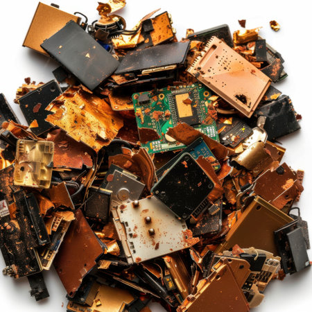 A striking image of a colorful pile of discarded electronic waste featuring circuit boards and various components scattered on a bright white background.