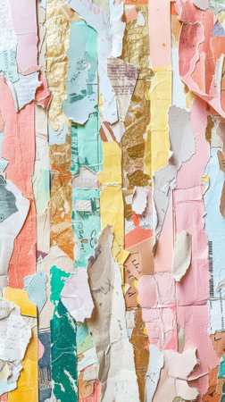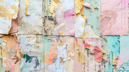 Fashionable background with a collage of torn paper from magazines, variety of patterns. Pastel colours. Generative AI.