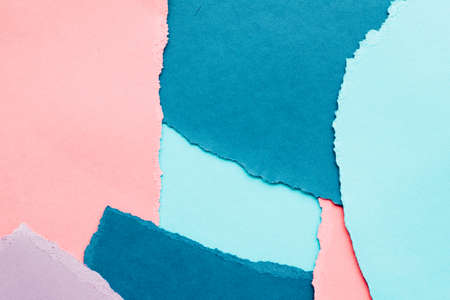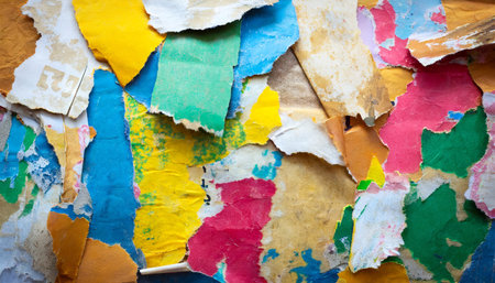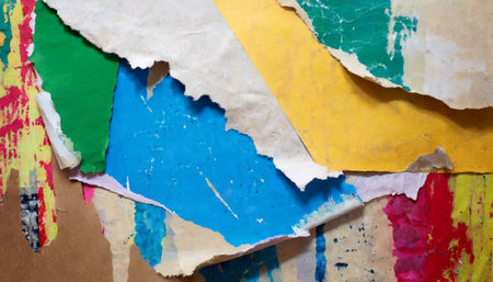 A vibrant and colorful arrangement of torn paper pieces creates an abstract background, showcasing a mix of hues and textures perfect for artistic projects or design use.